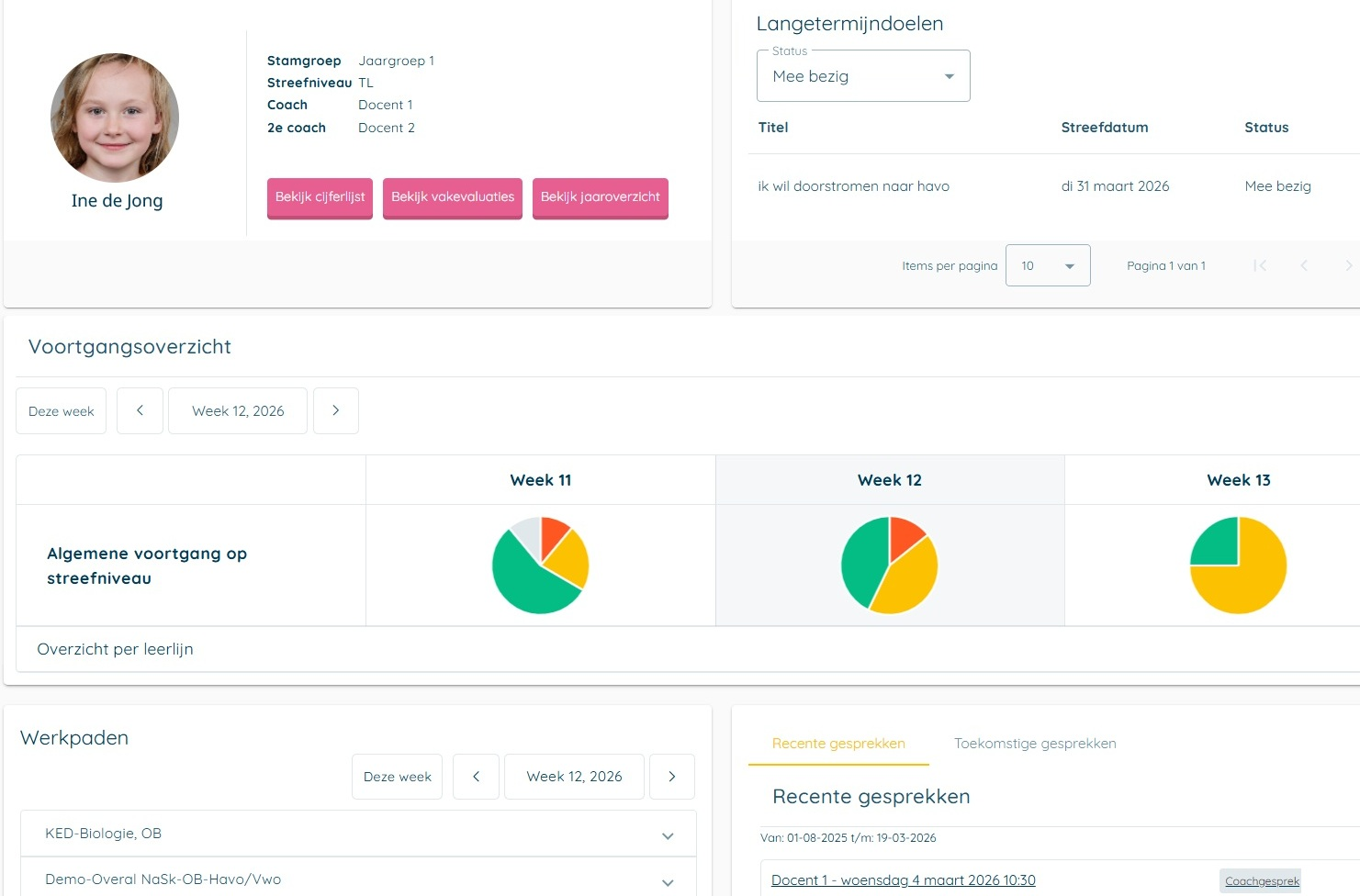 - Een lijst van de werkpaden waar de leerling mee bezig is, inclusief de activiteiten die de leerling voor elk werkpad moet doen.